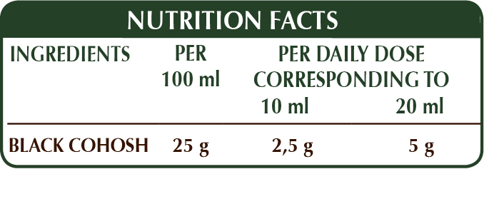 Alcohol-free whole liquid extract obtained from: bi-distilled vegetable glycerine, pure water, black cohosh (Actaea o Cimicifuga racemosa) rhizomes.