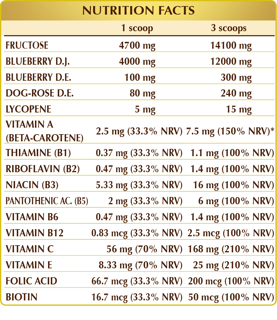 Fructose, blueberry (Vaccinium myrtillus) fruit D.J., corn or rice-based maltodextrins, blueberry (Vaccinium myrtillus) fruit D.E. (standardized to 25% antocianosids), dog-rose (Rosa canina) fruit W.D.E. (standardized to 70% vitamin C), tomato (Solanum lycopersicum) fruit D.E. (standardized to 10% lycopene), beta-carotene (standardized to 10%), vitamin E (DL-α-tocopheryl acetate), vitamin B3 (nicotinamide), vitamin B5 (calcium pantothenate), activated vitamin B2 (sodium riboflavin-5-phosphate), activated vitamin B6 (pyridoxal-5-phosphate), vitamin B1 (thiamine hydrochloride), activated folic acid (L-methylfolate calcium), biotin, activated vitamin B12 (5-deoxyadenosylcobalamin, methylcobalamin).