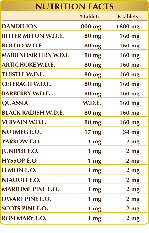 Supplement based on plant extracts and nutrients with essential oils. Boldo, artichoke, milk thistle, barberry, vervain and angelica promote liver function and, combined with bitter melon, quassia, black radish and essential oils of nutmeg, juniper and lemon, promote digestive function. In addition, dandelion leaves, boldo, black radish juniper and niaouli essential oils promote the drainage of body fluids and the urinary tract function.