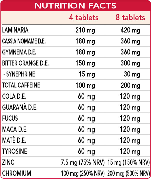 Oar weed (Laminaria cloustoni) thallus (seaweed), cassia nomame (Cassia mimosoides var. nomame makino) leaf D.E. (titrated to 8% flavan dimers), gymnema (Gymnema sylvestre) leaf D.E. (titrated to 75% gymnemic acid), microcrystalline cellulose°, gum arabic°, bitter orange (Citrus aurantium var. amara) unripe fruit peel D.E. (titrated to 10% synephrine), cola nut (Cola nitida) seed D.E. (titrated to 10% caffeine), fucus or sea oak (Fucus vesiculosus) thallus (sea-weed), guarana (Paullinia cupana) seed D.E. (titrated to 50% caffeine), (L-)tyrosine, Peruvian ginseng (Lepidium meyenii) root D.E. (titrated to 2.5% beta-sitosterols), mate (Ilex paraguariensis) leaf D.E. (titrated to 8% caffeine), caffeine, zinc gluconate, corn or rice-derived maltodextrins, silicon dioxide°°, plant-based magnesium stearate°°, chromium picolinate. °Bulking agent. °°Anti-caking agent.