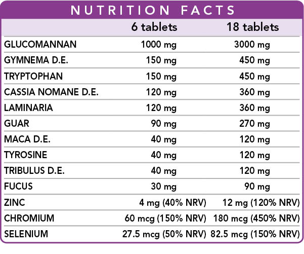 Glucomannan contributes to weight loss* whereas guar gum enhances satiety and reduces the absorption of nutrients. Gymnema helps stave off hunger pangs and curb cravings, whereas oraweed and bladderwrack (fucus) stimulate metabolism. Cassia nomame promotes triglyceride and cholesterol metabolism whereas gymnema increases carbohydrate metabolism and, in combination with bladderwrack, takes part in lipid metabolism. Cassia nomame and bladderwrack help you maintain a healthy body weight whereas maca and puncturevine carry out a tonic activity useful in combating physical and mental fatigue. Selenium promotes spermatogenesis whereas zinc helps maintain normal testosterone levels in the blood, promoting male reproduction and fertility.