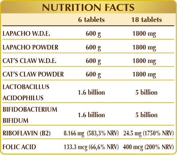 Lapacho or pau d'arco (Tecoma curialis or Tabebuia avellanedae) bark powder and W.D.E., cat's claw (Uncaria tomentosa) bark powder and W.D.E., microcrystalline cellulose°, gum arabic°, silicon dioxide°°, lactic acid bacteria (Lactobacillus acidophilus SGL11 and Bifidobacterium bifidum SGB02), plant-based magnesium stearate°°, Activated vitamin B2 (riboflavin-5-phosphate sodium) and activated folic acid (L-methylfolate calcium).