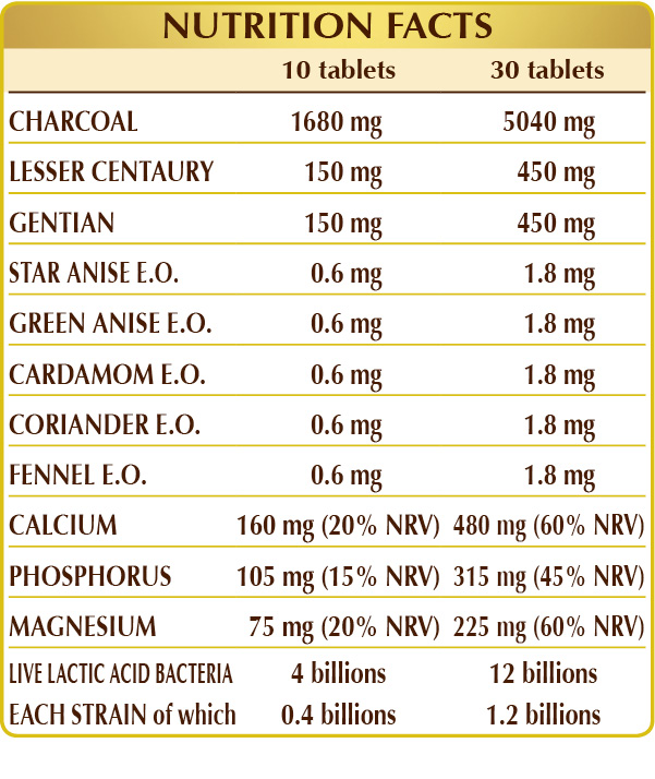 Pure plant charcoal (Carbo vegetabilis) of wood source, microcrystalline cellulose°, gum arabic°, calcium phosphate dibasic, calcium phosphate tribasic, magnesium hydroxide, lesser centaury (Centaurium erythraea) tops, gentian (Gentiana lutea) roots, a mixture of live lactic acid bacteria (standardized to 10% in each of the following strains: Bifidobacterium bifidum SD5215, breve SD5206, lactis SD5219; Lactobacillus acidophilus SD5212, brevis SD5214, bulgaricus SD5589, casei SD5213, paracasei SD5275, plantarum SD5209, rhamnosus SD5217), plant-based magnesium stearate°°, fennel (Foeniculum vulgare) fruit E.O., green anise (Pimpinella anisum) fruit E.O., star anise (Illicium verum) fruit E.O., cardamom (Elettaria cardamomum) fruit E.O., coriander (Coriandrum sativum) fruit E.O.