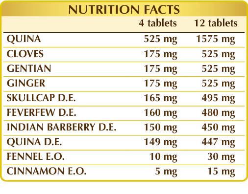 Cinchona (Cinchona calisaya) bark powder, clove (Eugenia caryophyllata) flower bud powder, gentian (Gentiana lutea) root powder, ginger (Zingiber officinalis) rhizome powder, skullcap (Scutellaria baicalensis) root D.E. (titrated to 95% baicalin), feverfew or chrysanthemum parthenium (Tanacetum parthenium) flower head D.E. (titrated to 0.8% parthenolide), Indian barberry (Berberis aristata) bark D.E. (titrated to 97% berberine)), cinchona (Cinchona calisaya) bark D.E. (titrated to 99% quinine sulfate), microcrystalline cellulose°, gum Arabic°, silicon dioxide°°, fennel (Foeniculum vulgare) fruit E.O., plant-based magnesium stearate°°, cinnamon (Cinnamomum zeylanicum) bark E.O.