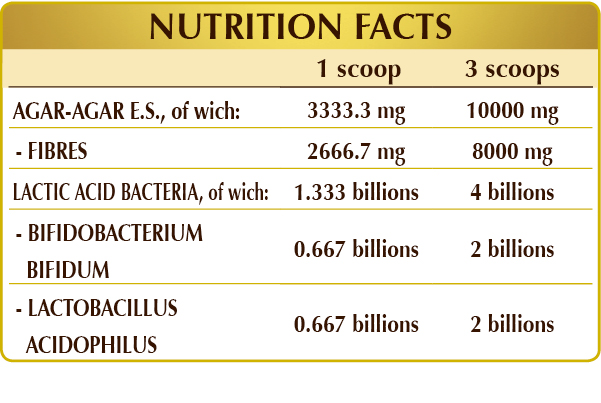 Agar-agar is a soluble fibre that is not digested nor absorbed by the gut; it helps keep the intestine clean, supporting regular bowel movements and normalising the compactness and volume of faecal material. Probiotic lactic acid bacteria can be useful in maintaining healthy gut flora balance.