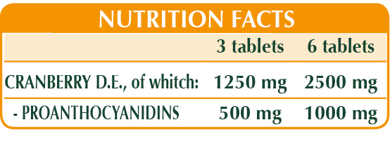 American cranberry (Vaccinium macrocarpon) fruit D.E. (standardized to 40% proanthocyanidins), microcrystalline cellulose°, gum arabic°, silicon dioxide°°, plant-based magnesium stearate°°.
