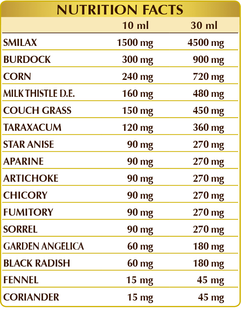 Sarsaparilla, burdock and fumitory help maintain skin health and, in combination with milk thistle, couch grass, dandelion, cleavers, artichoke and yellow dock, support the body's cleansing functions. In addition, corn, chicory, cleavers, horseradish and fennel support the drainage of body fluid whereas milk thistle, dandelion and chicory support liver function.