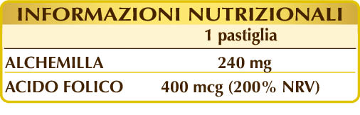 Food supplement based on folic acid and lady's mantle. For women of childbearing age, in anticipation of a pregnancy, supplemental intake of folic acid is useful for increasing maternal folate levels, which, if low, are a risk factor for the development of neural tube defects in the foetus*; it also contributes to the growth of maternal tissues. More generally, folic acid takes part in the process of cell division, helps strengthen the immune system, reduce tiredness and fatigue and maintain normal psychological function. Furthermore, it is involved in the synthesis of amino acids, in homocysteine metabolism and in haematopoiesis, i.e. the formation and maturation of all blood cells.