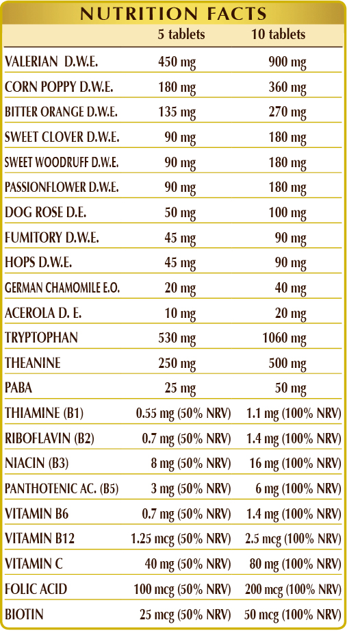 Herbal supplement fortified with amino acids and vitamins. Valerian, passion flower, sweet woodruff, hops and chamomile help induce sleep and, in association with bitter orange, promote relaxation. Valerian and hops are can relieve stress, bitter orange and chamomile help maintain mental well-being. Moreover, vitamins B1, B3, B6, B12, C, folic acid and biotin promote normal psychological function.