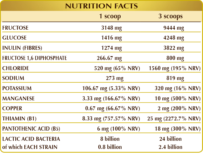 Fructose, glucose (dextrose), chicory (Cichorium intybus) root dry extract (standardized with 90% in inulin), sodium chloride (sea salt), corn or rice maltodextrins, fructose 1.6 diphosphate, potassium chloride, caramel flavouring, a blend of lactic acid bacteria (standardized with 10% in each of the following strains: Bifidobacterium bifidum SD5215, breve SD5206, lactis SD5219; Lactobacillus acidophilus SD5212, brevis SD5214, bulgaricus SD5589, casei SD5213, paracasei SD5275, plantarum SD5209, rhamnosus SD5217), manganese gluconate, vitamin B1 (thiamine hydrochloride), vitamin B5 (calcium pantothenate), copper gluconate.