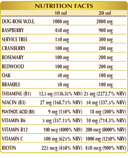 Food supplement made from glycerine macerate of fresh meristematic tissues, high in vitamins that all contribute to normal energy metabolism. In particular, vitamins B6, B12, and C support normal function of the immune system, and, along with vitamins B3 and B5, reduce tiredness and fatigue. Vitamin B3 contributes to the maintenance of normal skin, and vitamin B6 is involved in the regulation of hormonal activity. Furthermore, biotin contributes to the maintenance of hair health, while vitamin C protects cells from oxidative stress and promotes collagen formation, helping to maintain the normal functions of blood vessels, bones, cartilage, skin, teeth, and gums.