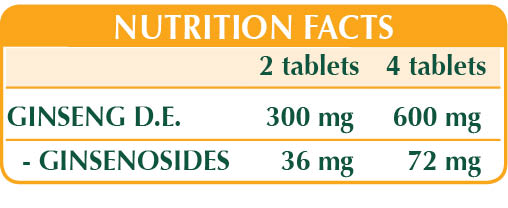 Ginseng (Panax ginseng) root and leaf D.E. (standardized to 12% ginsenosides), microcrystalline cellulose°, gum arabic°, corn- or rice-based maltodextrins, silicon dioxide°°, plant-based magnesium stearate°°.