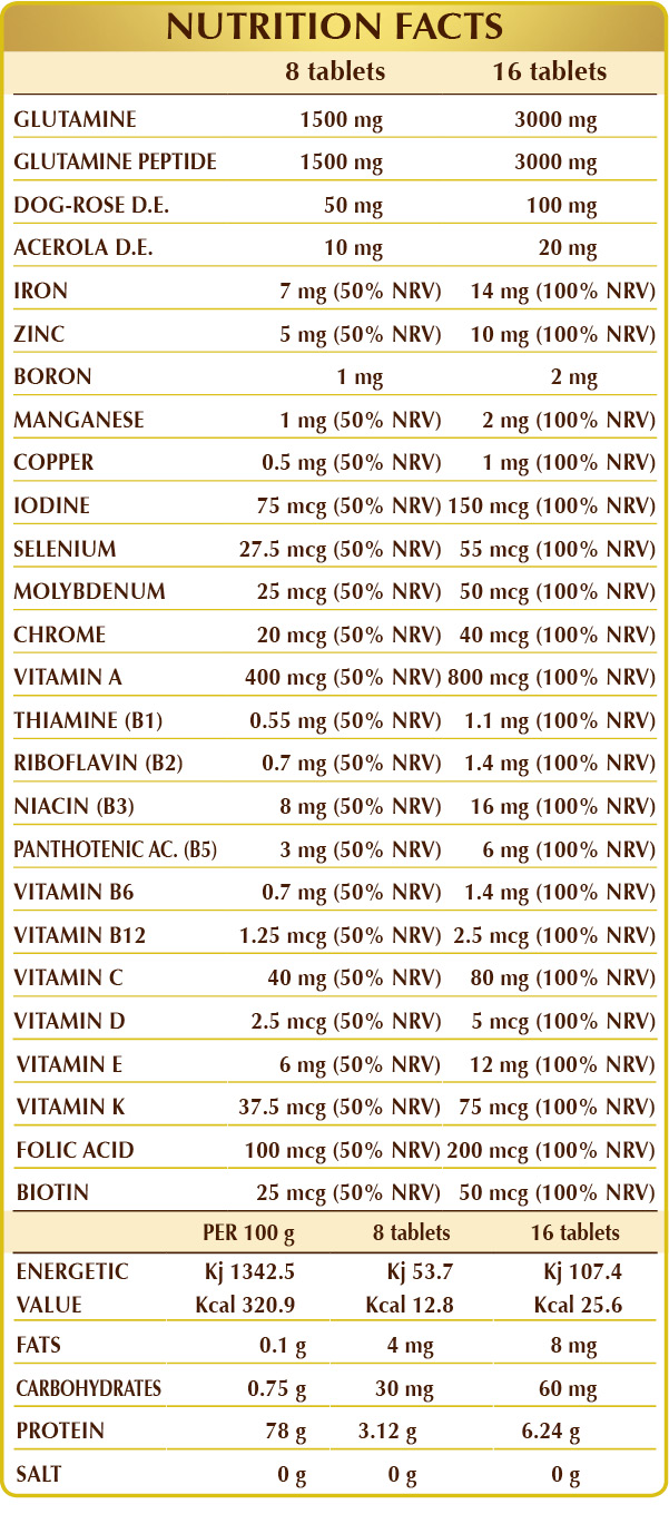 (L-)glutamine, glutamine peptide, microcrystalline cellulose°, gum arabic°, food-grade gelatin, silicon dioxide°°, dog rose (Rosa canina) fruit D.E. (titrated to 70% vitamin C), zinc gluconate, ferric ammonium citrate, plant-based magnesium stereate°°, plant-derived vitamin E (D-α-tocopheryl acetate), acerola (Malpighia glabra) fruit D.E. (titrated to 50% vitamin C), sodium borate, manganese gluconate, vitamin B3 (nicotinamide), vitamin B5 (calcium pantothenate), vitamin A (retinyl acetate), copper sulfate, vitamin B6 (pyridoxine hydrochloride), vitamin K1 (phylloquinone), vitamin B2 (riboflavin), vitamin B1 (thiamin hydrochloride), chromium picolinate, folic acid, potassium iodide, sodium selinite, sodium molybdate, biotin, plant-based vitamin D3 (cholecalciferol) (extracted from the Cladonia rangiferina lichen), vitamin B12 (cyanocobalamin).
