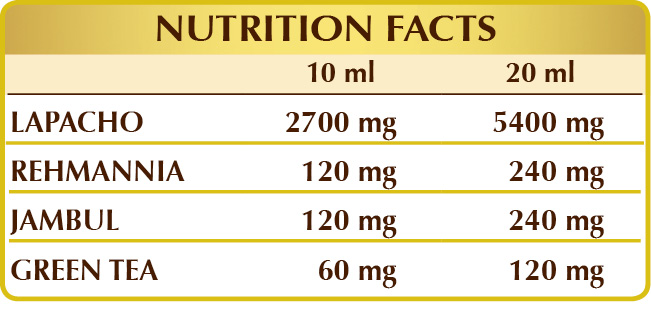Pure water, bidistilled vegetable glycerine, lapacho or pau d’arco (Tecoma curialis or Tabebuia avellanedae) bark W.L.E., Chinese foxglove (Rehmannia glutinosa) root W.L.E., jambul, or rose apple, (Syzygium jambos) seed W.L.E., green tea (Camellia sinensis) leaf W.L.E.; natural sweeteners: steviol glycosides,.