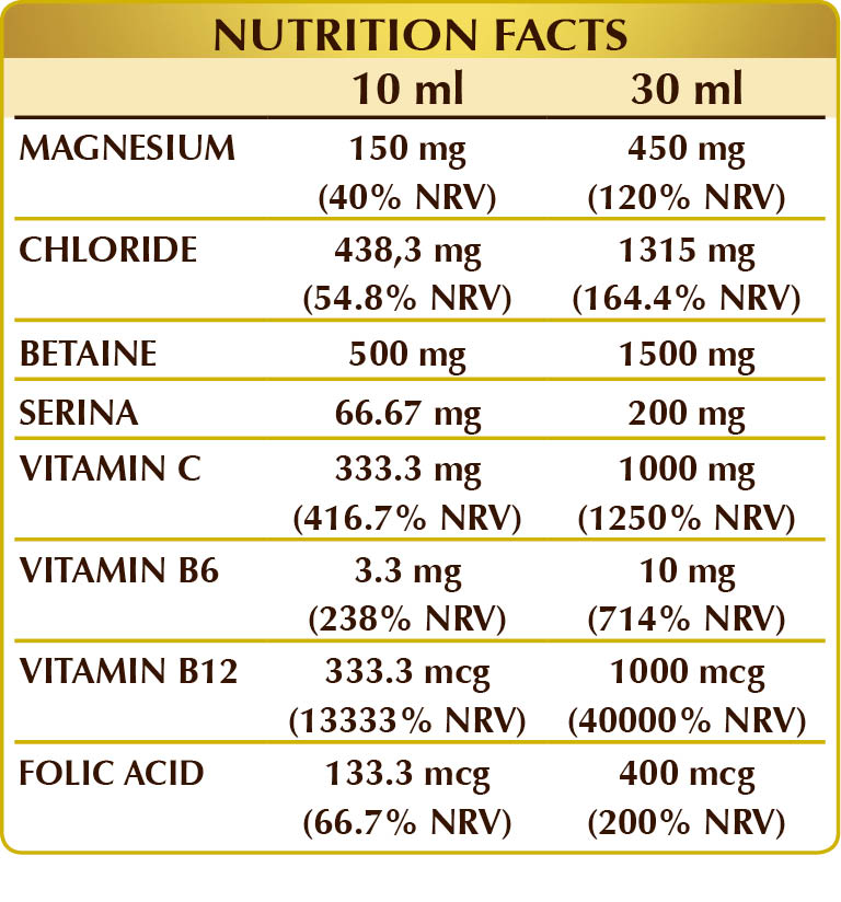 Bidistilled vegetable glycerin, pure water, betaine base, dog rose (Rosa canina) fruit dry full-spectrum extract containing the entire phytocomplex (titrated to 50% vitamin C), magnesium chloride hexahydrate; natural-origin sweeteners: erythritol, steviol glycosides from stevia, thaumatin; (L-)serine, activated vitamin B6 (pyridoxal 5-phosphate), activated vitamin B12 (5-deoxyadenosylcobalamin, methylcobalamin), activated folic acid (calcium L-methylfolate).