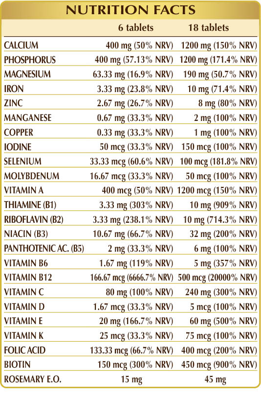 Dibasic calcium phosphate, magnesium glycerophosphate, microcrystalline cellulose°, gum arabic°, plant-dervied magnesium stearate°°, vitamin C (ascorbic acid), silicon dioxide°°, vitamin E of vegetal origin (D-α-tocopheryl acetate), iron gluconate, zinc gluconate, rosemary (Rosmarinus officinalis) flowering tops E.O., vitamin B3 (inositol hexanicotinate, nicotinamide), manganese gluconate, activated vitamin B2 (riboflavin 5-sodium phosphate), vitamin B1 (thiamine hydrochloride), vitamin A (retinyl acetate), activated vitamin B6 (pyridoxal-5-phosphate), copper gluconate, vitamin B5 (calcium pantothenate), lichen (Cladonia rangiferina) thallus D.E. (titrated to vitamin D3 cholecalcopherol 100,000 IU/g), activated vitamin B12 (5-deoxyadenosylcobalamin, methicobalamin), activated folic acid (calcium L-methylfolate), sodium selenite, potassium iodide, sodium molybdate, biotin, vitamin K1 (phylloquinone) . °Bulking agent °°Anti-caking agent