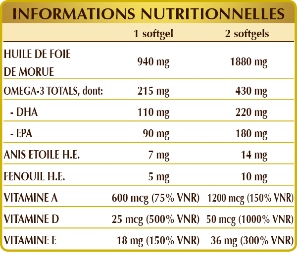 Cod liver oil, natural vitamin E (D-α-tocopherol), star anise (Illicium verum) fruit E.O., fennel (Foeniculum vulgare) fruit E.O., vitamin A (Retinyl palmitate), vitamin D3 (cholecalciferol); excipients (softgels): food-grade gelatin and glycerine.