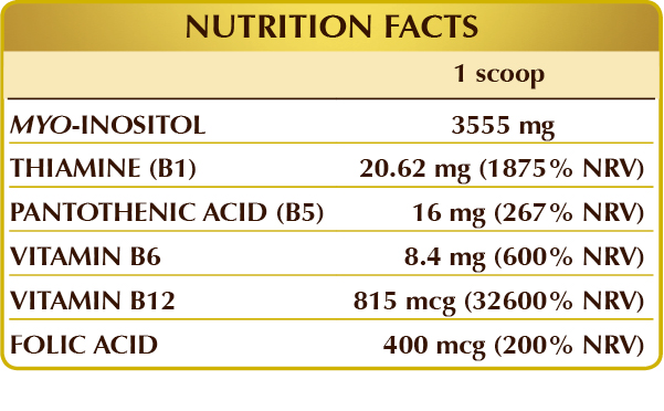 Plant-derived myo-inositol (extracted from corn seeds), maltodextrins from corn or rice, vitamin B1 (thiamine hydrochloride), vitamin B5 (calcium pantothenate), activated vitamin B6 (pyridoxal-5-phosphate), activated vitamin B12 (5-deoxyadenosylcobalamin, methylcobalamin), activated folic acid (L-methylfolate calcium).