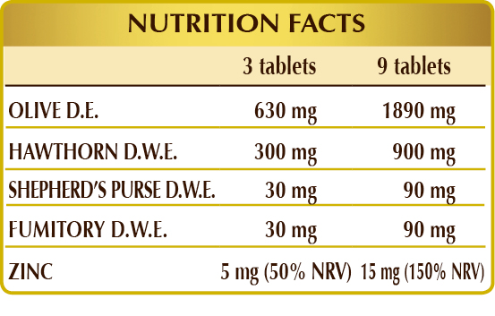 Olive tree (Olea europaea) leaf D.E. (titrated to 40% oleuropein), hawthorn (Crataegus oxyacantha) flower and leaf W.D.E., gum Arabic°, microcrystalline cellulose°, zinc gluconate, shepherd's purse (Capsella bursa-pastoris) herb W.D.E., fumitory (Fumaria officinalis) flowering herb W.D.E., silicon dioxide°°, plant-based magnesium stearate°°. °Bulking agent °°Anti-caking agent