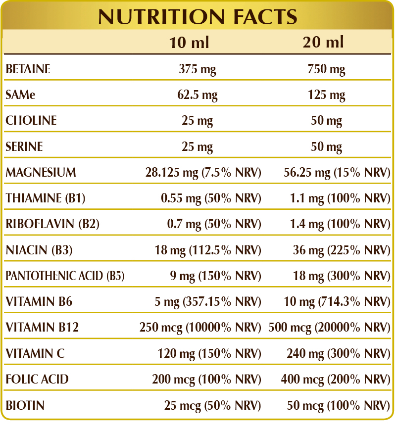 Bidistilled vegetable glycerin, purified water, betaine, magnesium glycerophosphate, SAMe (S-adenosyl methionine disulfate tosylate), vitamin C (ascorbic acid), choline tartrate, (L-)serine, vitamin B3 (nicotinamide), vitamin B5 (calcium pantothenate), activated vitamin B6 (pyridoxal-5-phosphate); natural-origin sweeteners: steviol glycosides from stevia, thaumatin; activated vitamin B2 (sodium riboflavin 5-phosphate), vitamin B1 (thiamine hydrochloride), activated folic acid (calcium L-methylfolate), biotin, activated vitamin B12 (5-deoxyadenosylcobalamin and methylcobalamin).