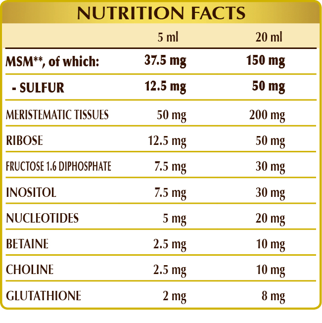 Bidistilled vegetable glycerine, pure water; glycerine macerate of fresh meristematic tissues: field maple (Acer campestris) buds, white hornbeam (Carpinus betulus) buds, chestnut (Castanea vesca, or Castanea sativa) buds, field elm (Ulmus campestris, or Ulmus minor) buds; MSM (methylsulfonylmethane), ribose, fructose 1.6-diphosphate; acidity regulator: citric acid; inositol, betaine citrate, tartrate choline; nucleotide blend: AMP (adenosine monophosphate), CMP (cytosine monophosphate), GMP (guanosine monophosphate), UMP (uridine monophosphate); glutathione; natural sweetener: thaumatin (E957). Sweetened only with natural sweeteners.