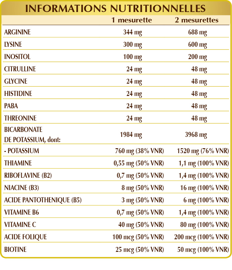 Corn or rice-derived maltrodextrins, potassium bicarbonate, (L-)arginine, (L-)lysine HCL or hydrochloride, plant-derived Myo-inositol (extracted from corn seeds), potassium ascorbate, (L-)citrulline, glycine, (L-)histidine, PABA (para-aminobenzoic acid), (L-)threonine; natural-origin sweeteners: steviol glycosides from stevia, thaumatin; vitamin B3 (nicotinamide), vitamin B5 (calcium pantothenate), activated vitamin B2 (sodium riboflavin-5-phosphate), activated vitamin B6 (pyridoxal-5-phosphate), vitamin B1 (thiamine hydrochloride), activated folic acid (L-methylfolate calcium), biotin.