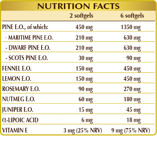 Maritime pine (Pinus pinaster) needle and bud E.O., mugo or pumilio pine (Pinus montana) needle and bud E.O., red grape (Vitis vinifera) seed oil, fennel (Foeniculum vulgare) seed E.O., lemon (Citrus limonum) peel fruit E.O., rosemary (Rosmarinus officinalis) leaf E.O., nutmeg (Myristica fragrans) seeds and arils (Macis) E.O., Scots pine (Pinus sylvestris) needle and bud E.O., juniper (Juniperus communis) fruit E.O., α-lipoic acid, vitamin E (DL-α-tocopheryl acetate); excipients (softgel): food-grade gelatin and glycerine.