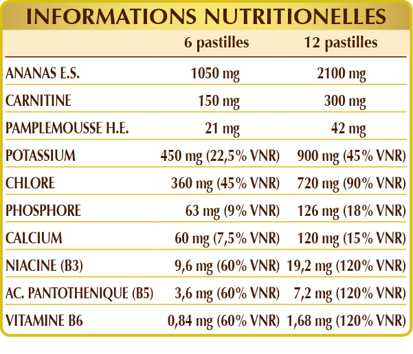 Food supplement useful as adjuvant to a low-calorie formula diet for body weight loss. Pineapple reduces the unsightly skin effects of cellulite and, combined with grapefruit, promotes drainage of body fluids. Pineapple can also improve microcirculation and relieve the feeling of heaviness in the legs. Calcium, phosphorus and vitamins B3, B5 and B6 contribute to normal energy metabolism.