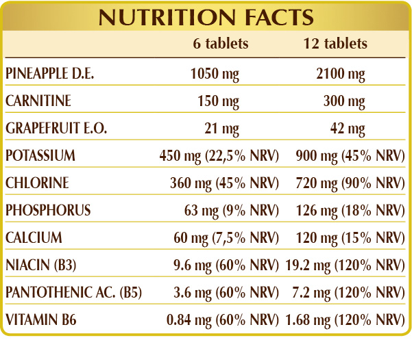 Food supplement useful as adjuvant to a low-calorie formula diet for body weight loss. Pineapple reduces the unsightly skin effects of cellulite and, combined with grapefruit, promotes drainage of body fluids. Pineapple can also improve microcirculation and relieve the feeling of heaviness in the legs. Calcium, phosphorus and vitamins B3, B5 and B6 contribute to normal energy metabolism.