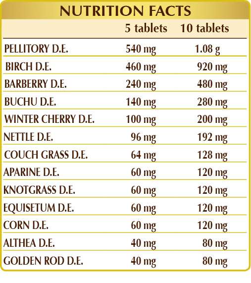 Pellitory (Parietaria officinalis) herb D.E., white birch (Betula alba or pubescens) leaf D.W.E., microcrystalline cellulose°, gum arabic°, silicon dioxide°°, barberry (Berberis vulgaris) root bark D.W.E., buchu (Barosma betulina) leaf D.E., winter cherry (Physalis alkekengi) fruit D.W.E., nettle (Urtica dioica) leaf and root D.W.E., couch grass (Agropyron repens) rhizome D.W.E., aparine (Galium aparine) flowering herb D.W.E., knotgrass (Polygonum aviculare) herb D.W.E., equisetum or horsetail (Equisetum arvense) herb D.W.E., corn or maize (Zea mays) stigma D.W.E., marshmallow (Althaea officinalis) root D.W.E., goldenrod (Solidago virga-aurea) flowering herb D.W.E., plant-based magnesium stearate.°°
