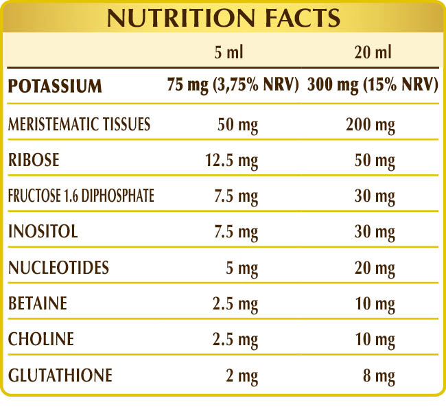 Bidistilled vegetable glycerin, pure water, potassium citrate, potassium gluconate; fresh meristematic tissue: maize or corn (Zea mays var. saccharata) young roots, ash (Fraxinus excelsior) buds, chestnut (Castanea vesca or Castanea sativa) buds, hawthorn (Crataegus oxyacantha or Crataegus monogyna) young shoots; ribose, fructose 1.6-diphosphate; acidity regulator: citric acid; inositol, betaine citrate, tartrate choline; nucleotide blend: AMP (adenosine monophosphate), CMP (cytosine monophosphate), GMP (guanosine monophosphate), UMP (uridine monophosphate); glutathione; natural sweetener: thaumatin (E957).