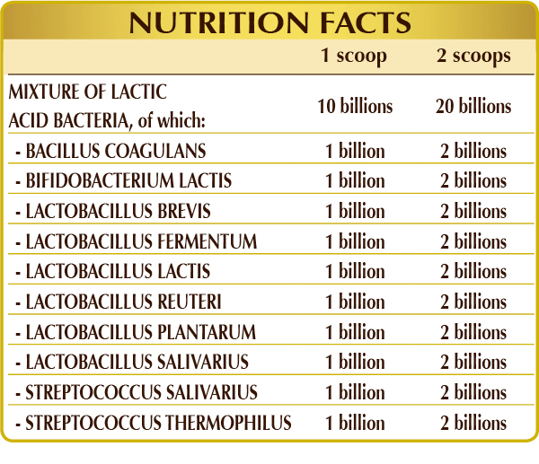 Corn or rice-based maltodextrins, a mixture of lactic acid bacteria (standardized to 23.5 Mld/day in each of the following strains: Bacillus coagulans BCM9; Bifidobacterium lactis BALM27; Lactobacillus brevis LBRM45, fermentum LFM33, lactis LLM48, plantarum LPM27, reuteri LBRR16, salivarius LSM51, Streptococcus salivarius SSM12, thermophilus STM9).