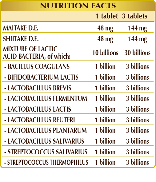 Microcrystalline cellulose°, gum arabic°, maitake (Grifola frondosa) thallus D.E. (titrated to 30% polysaccharides), shiitake (Lentinula edodes) thallus D.E. (titrated to 30% polysaccharides), corn or rice-based maltodextrins, a mixture of lactic acid bacteria (titrated to 23.5 Mld/day in each of the following strains: Bacillus coagulans BCM9; Bifidobacterium lactis BALM27; Lactobacillus brevis LBRM45, fermentum LFM33, lactis LLM48, plantarum LPM27, reuteri LBRR16, salivarius LSM51; Streptococcus salivarius SSM12, thermophilus STM9), silicon dioxide°°, plant-based magnesium stearate°°; plant-based sweeteners: steviol glycosides from stevia and thaumatin. °Bulking agent. °°Anti-caking agent