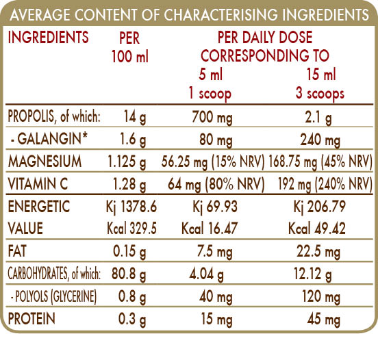 Bidistilled vegetable glycerine, propolis (Propolis) resin, magnesium chloride, vitamin C (ascorbic acid), pure water.