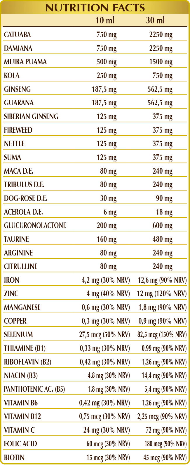 Bidistilled vegetable glycerin, pure water, catuaba (Anemopaegma mirandum) bark W.L.E., damiana (Turnera diffusa) leaf W.L.E., muira puama (Ptychopetalum olacoides) wood W.L.E., kola (Cola nitida) seed W.L.E., glucuronolactone, ginseng (Panax ginseng) root W.L.E., guarana (Paullinia cupana) green seed (not roasted) W.L.E., taurine, eleutherococcus or Siberian ginseng (Eleutherococcus senticosus) root W.L.E., fireweed (Epilobium parviflorum) herb W.L.E., nettle (Urtica dioica) root W.L.E., suma or Brazilian ginseng (Pfaffia paniculata) root W.L.E., (L-)arginine, (L-)citrulline, maca or Peruvian ginseng (Lepidium meyenii) root D.E., tribulus (Tribulus terrestris) fruit D.E. (titrated to 90% saponins), dog-rose (Rosa canina) fruit D.E. (titrated to 70% vitamin C), ferric ammonium citrate, zinc gluconate, acerola (Malpighia glabra) fruit D.E. (titrated to 50% in vitamin C), manganese gluconate, vitamin B3 (niacin), vitamin B5 (calcium pantothenate), copper sulfate, vitamin B6 (pyridoxine hydrochloride), vitamin B2 (riboflavin), vitamin B1 (thiamin hydrochloride), sodium selinite, folic acid, biotin, vitamin B12 (cyanocobalamin).
