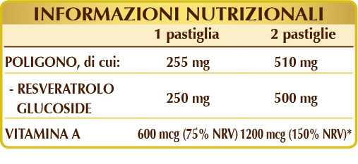 Food supplement based on Japanese knotweed extract, rich in resveratrol glucoside, and vitamin A. Japanese knotweed has multiple properties: it promotes cleansing functions, body fluid drainage, fluidity of bronchial secretions, regularity of menstrual cycle, and normal cardiovascular system function; it also exerts antioxidant and tonic actions, useful for countering physical and mental fatigue. Vitamin A, on the other hand, contributes to the process of cell specialization, helps maintain normal skin, mucous membranes, and vision, and supports the immune system normal function.