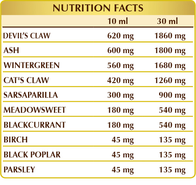 Devil's claw, ash, wintergreen, cat's claw, sarsaparilla, meadowsweet, blackcurrant and black poplar promote normal joint function. Furthermore, ash, meadowsweet, blackcurrant, white birch and parsley help maintain healthy drainage of body fluid and urinary tract function.