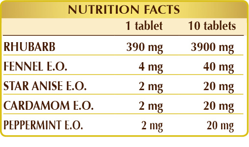Chinese rhubarb (Rheum palmatum) rhizomes, microcrystalline cellulose°, gum Arabic°, silicon dioxide°°, fennel (Foeniculum vulgare) fruit E.O., star anise (Illicium verum) fruit E.O., cardamom (Elettaria cardamomum) seed E.O., peppermint (Mentha piperita) leaf E.O., plant-derived magnesium stearate°°.