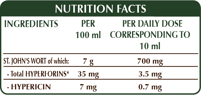 Alcohol-free whole liquid extract obtained from: bi-distilled vegetable glycerine, pure water, St. John's Wort (Hypericum perforatum) flowering herb.
