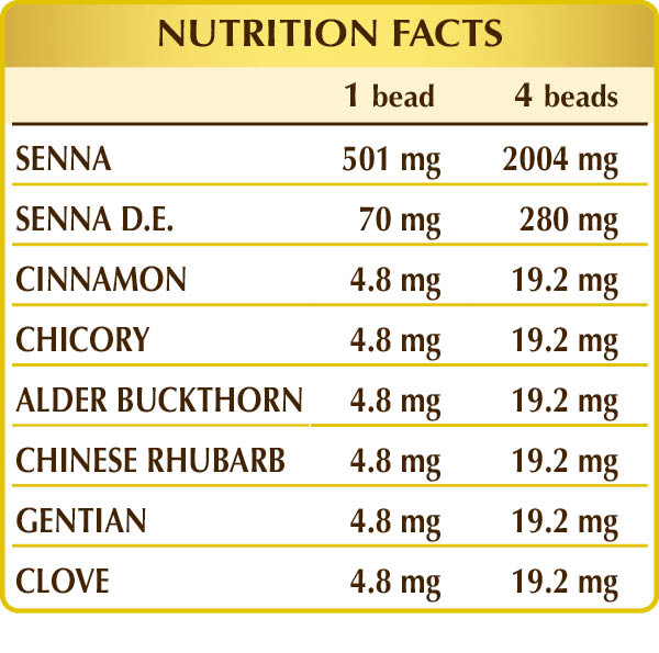 Senna (Cassia angustifolia) leaf Pulv, senna (Cassia angustifolia) leaf D.E., cinnamon (Cinnamomum zeylanicum) bark Pulv, chicory (Cichorium intybus) root Pulv, alder buckthorn (Rhamnus frangula) bark Pulv, Chinese rhubarb (Rheum palmatum) rhizome Pulv, gentian (Gentiana lutea) root Pulv, clove (Eugenia caryophyllata) flower bud Pulv.