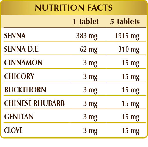 Senna (Cassia angustifolia) leaf Pulv, senna (Cassia angustifolia) leaf D.E., gum arabic°, microcrystalline cellulose°, silicon dioxide°°, cinnamon (Cinnamomum zeylanicum) bark Pulv, chicory (Cichorium intybus) root Pulv, alder buckthorn (Rhamnus frangula) bark Pulv, Chinese rhubarb (Rheum palmatum) rhizome Pulv, gentian (Gentiana lutea) root Pulv, clove (Eugenia caryophyllata) flower bud Pulv, plant-based magnesium stearate°°. Pulv. = (pulver) Powder