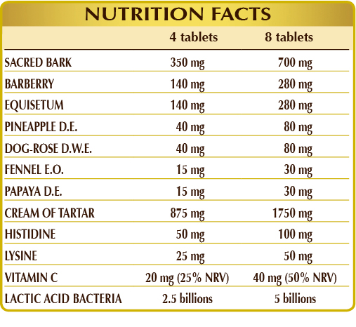 Cream of tartar from purified wine, buckthorn (Rhamnus purshiana) bark Pulv, barberry (Berberis vulgaris) root bark Pulv, equisetum or horsetail (Equisetum arvense) herb Pulv, microcrystalline cellulose°, gum arabic°, (L-)histidine, pineapple (Ananas sativus) fruit stem D.E. (bromelain 2500 GDU/g), dog rose (Rosa canina) fruit D.E. (titrated to 50% vitamin C), (L-)lysine, live lactic cultures (Bacillus coagulans or Lactobacillus sporanges MTCC 25157), silicon dioxide°°, papaya (Carica papaya) fruit D.E. (papain 30.000 U/mg), fennel (Foeniculum vulgare) fruit E.O., plant-based magnesium stearate.°°