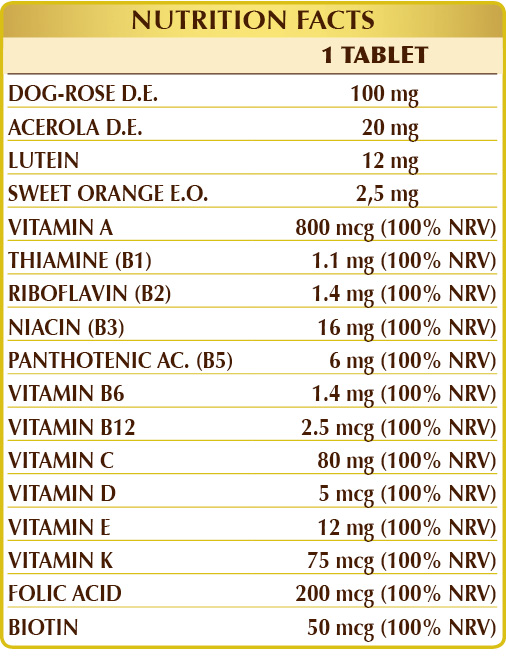Multivitamin supplement containing 100% NRV of all vitamins in one single tablet. Each vitamin has a specific function and, in particular, contributes to: protecting cells from oxidative stress (B2, C, E); maintaining normal function of the immune system (A, B6, B12, C, D, and folic acid), the nervous system (B1, B2, B3, B6, B12, C and biotin), bones (C, D, K) and visual capacity (B2, A); preventing physical tiredness and fatigue (B2, B3, B5, B6, B12, C and folic acid).