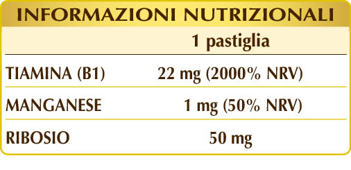 Vitamin B1 supplement, in chewable tablets, enriched with manganese and ribose. Vitamin B1 contributes to normal heart function, promotes the nervous system function, supports the psychological function and, combined with manganese, promotes energy metabolism.