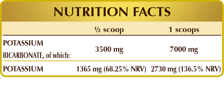 Potassium bicarbonate is an alkaline mineral and excellent source of potassium, which contributes to keeping healthy blood pressure and maintaining normal muscle and nerve function.