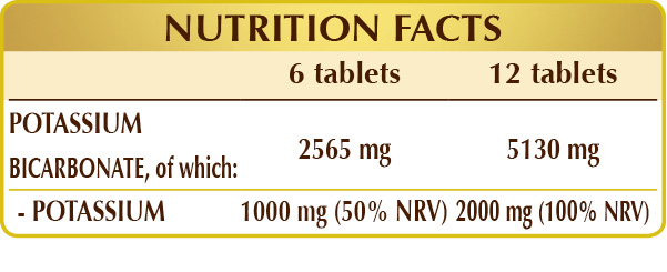 Potassium bicarbonate is an alkaline mineral and excellent source of potassium, which contributes to keeping healthy blood pressure and maintaining normal muscle and nerve function.