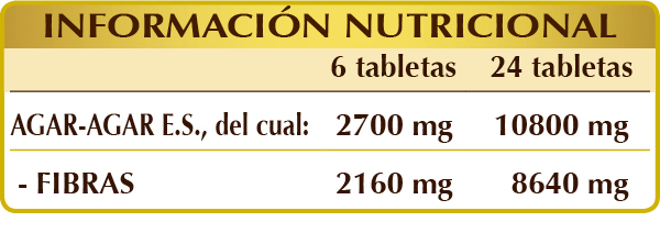 El agar-agar es una fibra soluble que no es digerida ni absorbida por el intestino; normaliza el volumen y la consistencia de las heces, favoreciendo la regularidad del tránsito intestinal.