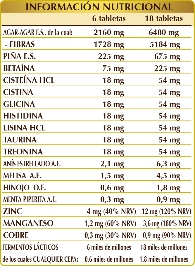 Agar-agar (Gelidium amansii) talo (alga) E.S., piña (Ananas comosus) tallos de los frutos E.S. (bromelina 2500 GDU/g), celulosa microcristalina°, goma arábiga°, betaína HCL o clorhidrato, gluconato de zinc, mezcla de fermentos lácticos (titulada al 10 % en cada una de las siguientes cepas: Bifidobacterium bifidum SD5215, breve SD5206, lactis SD5219; Lactobacillus acidophilus SD5212, brevis SD5214, bulgaricus SD5589, casei SD5213, paracasei SD5275, plantarum SD5209, rhamnosus SD5217), dióxido de silicio°°, (L-)cisteína HCL o clorhidrato, (L-)cistina, glicina, (L-)histidina, (L-)lisina HCL o clorhidrato, taurina, (L-)treonina, gluconato de manganeso, maltodextrinas de maíz o arroz, estearato de magnesio de origen vegetal°°, gluconato de cobre, anís estrellado (Illicium verum) frutos A.E., melisa (Melissa officinalis) hojas A.E., hinojo (Foeniculum vulgare) frutos A.E., menta piperita (Mentha piperita) hojas A.E.