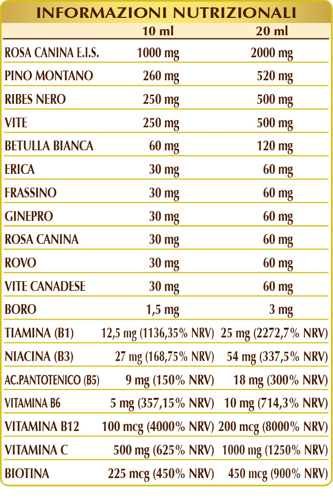 Glicerina vegetal bidestilada, agua pura, rosal silvestre (Rosa canina) frutos E.I.S. (titulado al 50% in vitamina C); macerado glicérico de tejidos meristemáticos frescos de: pino montano (Pinus montana o Pinus mugo) yemas, grosellero negro (Ribes nigrum) yemas, vid (Vitis vinifera) yemas, abedul blanco (Betula alba o Betula pendula) yemas y savia, brezo (Calluna vulgaris) brotes jóvenes, fresno (Fraxinus excelsior) yemas, enebro (Juniperus communis) brotes jóvenes, rosal silvestre (Rosa canina) brotes jóvenes, zarzamora (Rubus fruticosus) brotes jóvenes, parra virgen (Ampelopsis veitchii o Parthenocissus tricuspidata) brotes jóvenes; vitamina B1 (clorhidrato de tiamina), vitamina B3 (niacina, nicotinamida), borato de sodio, vitamina B5 (pantotenato de calcio), vitamina B6 (piridoxal-5-fosfato), biotina y vitamina B12 (metilcobalamina, 5'-desoxiadenosilcobalamina).