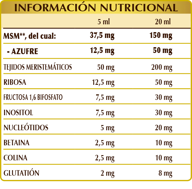 Glicerina vegetal bidestilada, agua pura; macerado glicerinado de tejidos meristemáticos frescos: arce campestre (Acer campestris) yemas, carpe blanco (Carpinus betulus) yemas, castaño (Castanea vesca, sinónimo Castanea sativa) yemas, olmo campestre (Ulmus campestris, sinónimo Ulmus minor) yemas; MSM (metilsulfonilmetano), ribosa, fructosa 1,6-bifosfato; corrector de acidez: ácido cítrico; inositol, citrato de betaína, tartrato de colina; mezcla de nucleótidos: AMP (monofosfato de adenosina), CMP (monofosfato de citosina), GMP (monofosfato de guanosina), UMP (monofosfato de uridina); glutatión reducido; edulcorante de origen natural: taumatina. Con edulcorantes de origen natural.